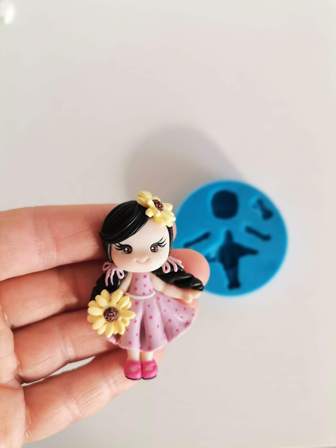 Matriță mini-păpușică cu rochiță, potrivită pentru broșe, mărțișoare, decorarea lingurițelor, fundelor, cordeluțelor; în funcție de dorința și inspirația fiecăruia.